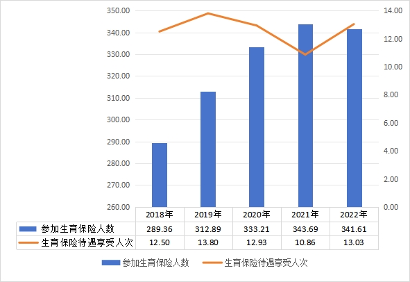 2022年全区参加生育保险341.61万人,比上年减少2.08万人,比上年减少0.61%。2022年享受各项生育保险待遇13.03万人次,比上年增长19.99%;生育保险基金支出15.09亿元,比上年降低0.51%。