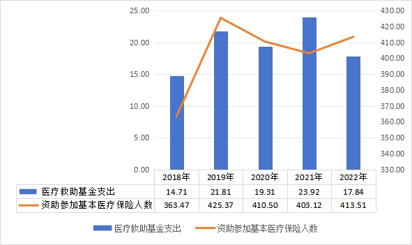 2022年全区医疗救助支出17.84亿元,医疗救助基金资助413.51万人[1]参加基本医疗保险,实施门诊和住院救助209.28万人次,全区次均住院救助、门诊救助分别为1010元、68元。2022年全区中央财政安排医疗救助补助资金18.04亿元。