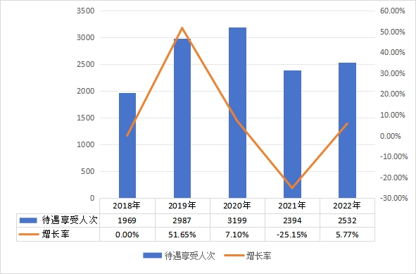 3.待遇享受。2022年参加居民医保人员享受待遇2532.18万人次,比上年增长5.77%。其中普通门急诊2003.69万人次,门诊慢特病269.40万人次,住院259.09万人次。