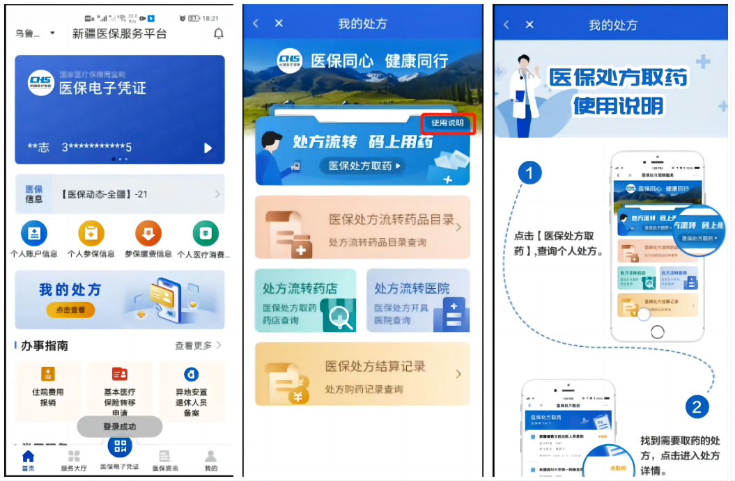 答:下载新疆医保服务平台APP或微信或支付宝搜索“新疆医保服务平台”,登录,进入【首页】-【我的处方】(需要在医院开具电子处方)。点击“使用说明”,可查看相关操作说明。